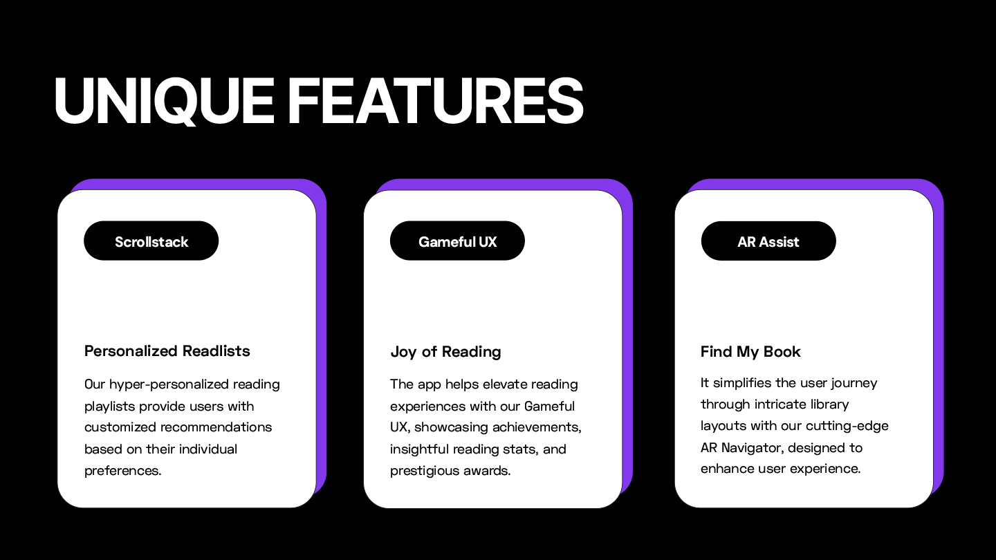 Defining the app concept, our team wants to emphasize on gamifying knowledge discovery, integrating online and offline read-and-borrowing book experience, provides user with personalized book recommendations and form a community in book finding and sharing. We want the app not just a tool for finding reading resources; it's a gateway to a vast world of knowledge and community, seamlessly integrating the digital and physical realms of the literary universe.